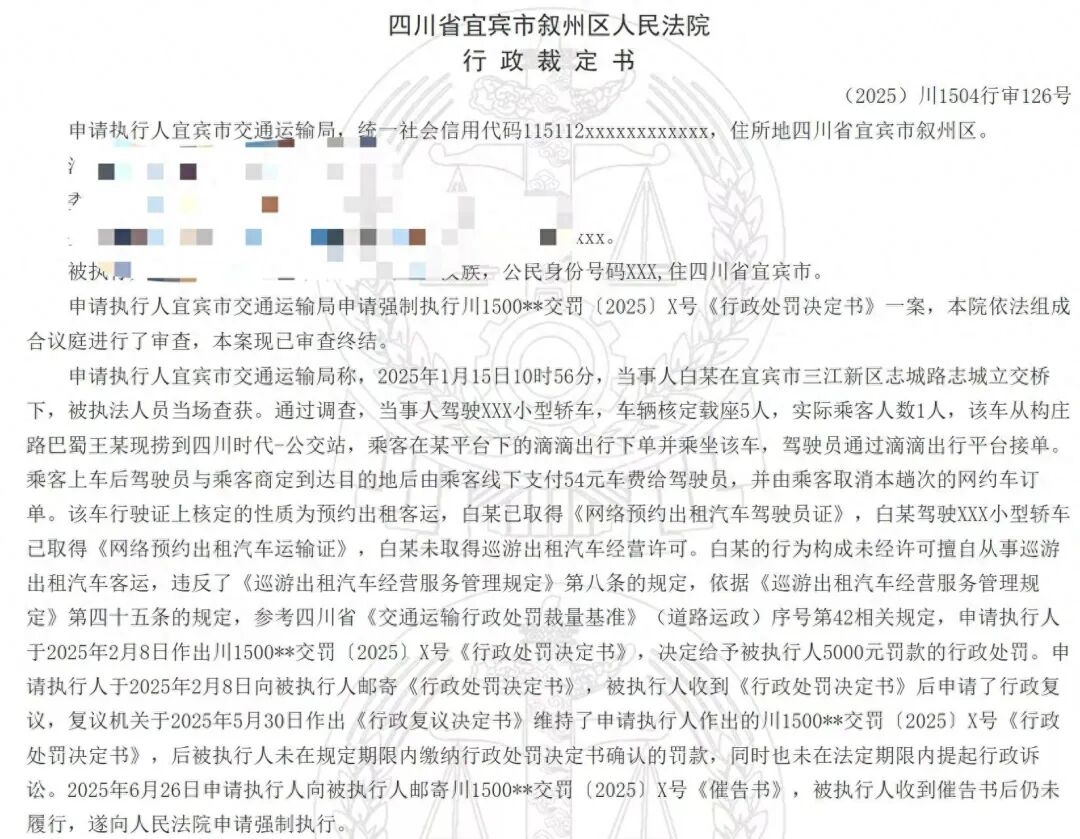 法院行政裁定书显示,2025年1月15日10时56分,当事人白某驾驶小型轿车金策宝,在宜宾市三江新区志城路志城立交桥下,被执法人员当场查获。调查显示,白某通过某出行平台接单,乘客上车后其与乘客商定到达目的地后由乘客线下支付54元车费,并由乘客取消本趟次的网约车订单。