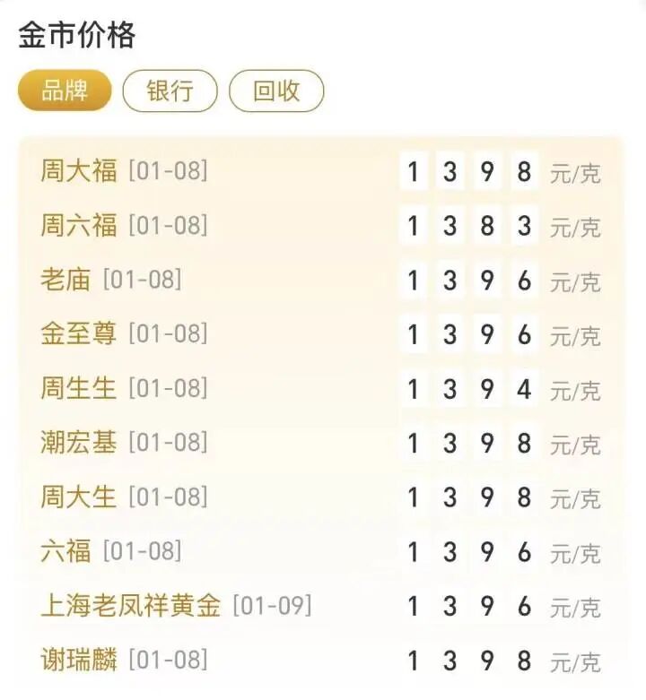 今天,各大金饰品牌的实时报价再次接近1400元/克。比如周大福、潮宏基、周大生、谢瑞麟的报价为1398元/克。其他品牌报价从1383元/克至1396元/克不等。