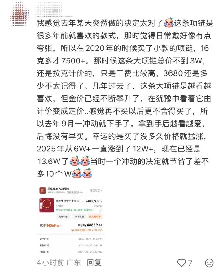 商品评价区一位买家留言说:自己在2024年4月购买了同款项链,金重69克总共花了45000元。而另外一位在2016年左右入手的买家说,自己的入手价格为2万元。