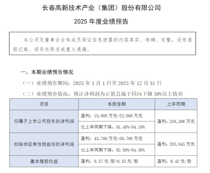 长春高新提醒,本次业绩预告为公司财务部门初步核算结果,未经注册会计师审计,具体财务数据将在2025年年度报告中详细披露。